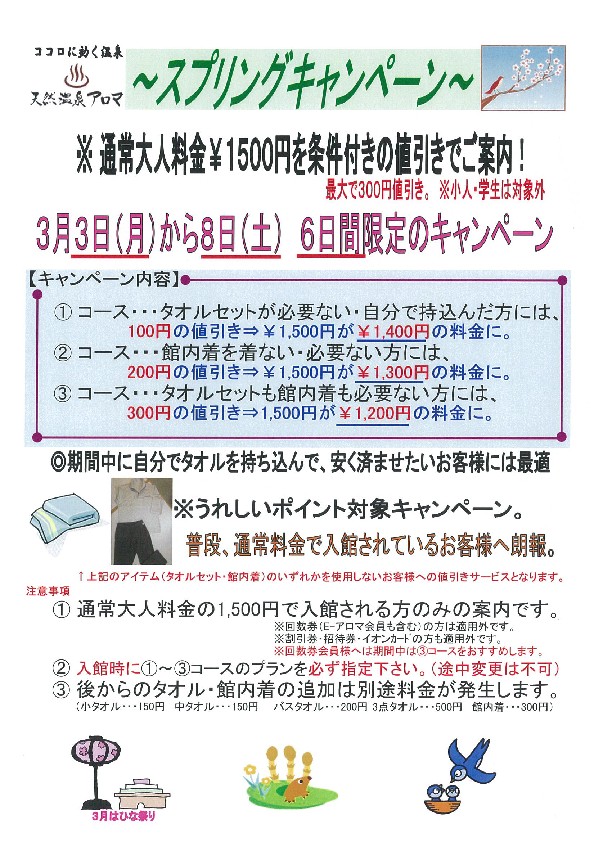 *キャンペーン期間中は、ご自身でタオルを持ってきたり、館内着を              使用しなければいつもよりお得に。